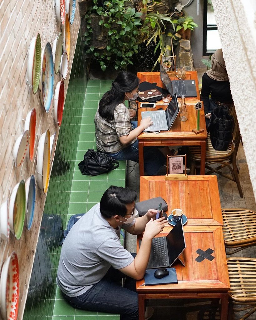 Beranjak ke area lainnya, yang masih di lantai dasar terdapat interior backyard yang areanya cukup spacious dengan dilengkapi meja dan kursi kayu. Dindingnya dilapisi bata berwarna putih dan keramik hijau serta dihiasi dengan piringan-piringan cantik bergambar bunga. Area ini memiliki ceiling yang cukup tinggi yang menembus ke area lantai duanya.